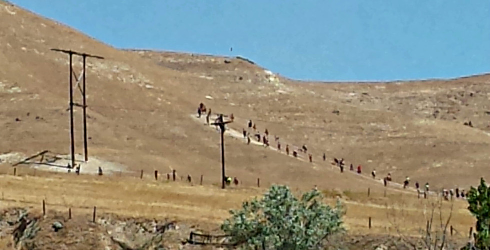 After going down, the course went right back up. At the top of the third hill was the "Spear Throw." I took aim and threw. My spear went a bit sideways on the flight and didn't stick, which meant 30 burpees. Those burpees were not fun. There was so much dust flying into my mouth on every one and it sucked the "I'm doing awesome" feeling right out of me.